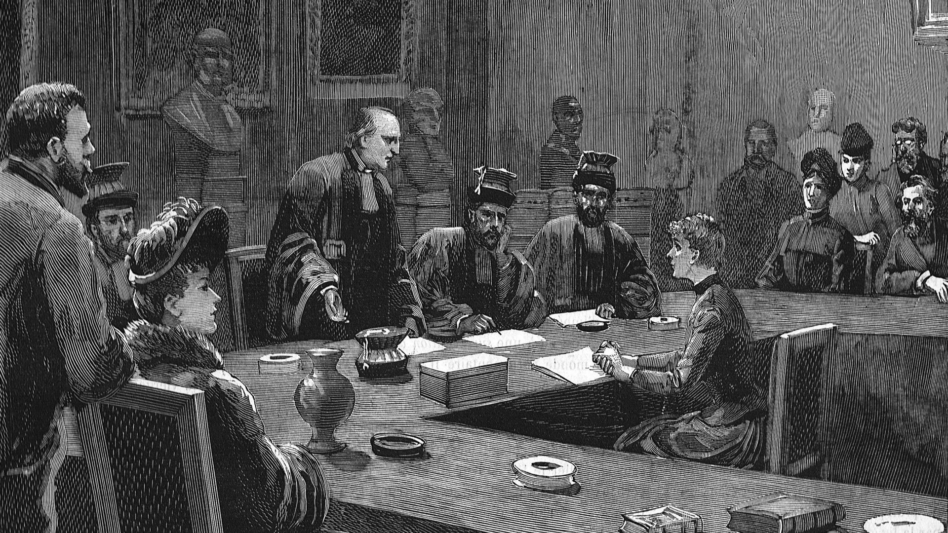© Dessin de Paul Destez, « Melle Schultze soutenant sa thèse de doctorat à l’école de médecine », L’Univers illustré, 22 décembre 1888 | Numerabilis – BIU Santé Médecine – Université Paris Cité