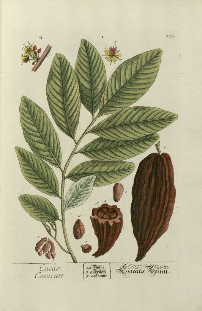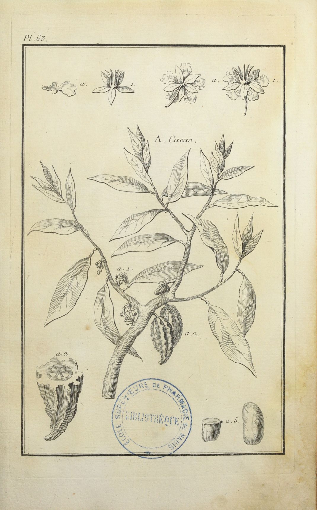 Ainsi, au XVIIIe siècle, le cacao était étudié par les botanistes, médecins et pharmaciens qui s’intéressaient à ses propriétés médicinales : une planche botanique datant de 1764, tirée d’un ouvrage illustrant la Matière médicale de l’apothicaire et médecin Étienne-Claude Geoffroy, le représente aux côtés d’autres végétaux d’usage thérapeutique. L’ouvrage promeut les vertus du chocolat « nourrissant et fortifiant ».