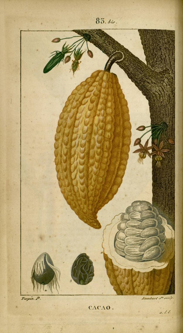 Côté botanique, des herbiers scientifiques conservés parmi les collections précieuses de la BIU Santé Médecine représentent avec un grand savoir-faire artistique et avec précision la fève de cacao. L’herbier d’Elizabeth Blackwell, A curious herbal: containing five hundred cuts, of the most useful plants, which are now used in the practice of physick, est un trésor de l’illustration scientifique et botanique du XVIIIe siècle.