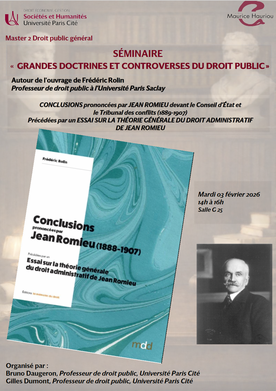 La première séance se tiendra le mardi 3 février 2026, de 14h à 16h, en salle G 25, et sera consacrée à l’ouvrage de Frédéric Rolin, professeur de droit public à l’Université Paris Saclay, intitulé « Conclusions prononcées par Jean Romieu devant le Conseil d’État et le Tribunal des conflits (1889-1907), précédées par un essai sur la théorie générale du droit administratif de Jean Romieu ».