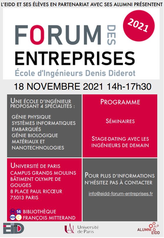 Le forum des entreprises 2021 se déroulera le 18 Novembre 2021 de 14h à 17h30.