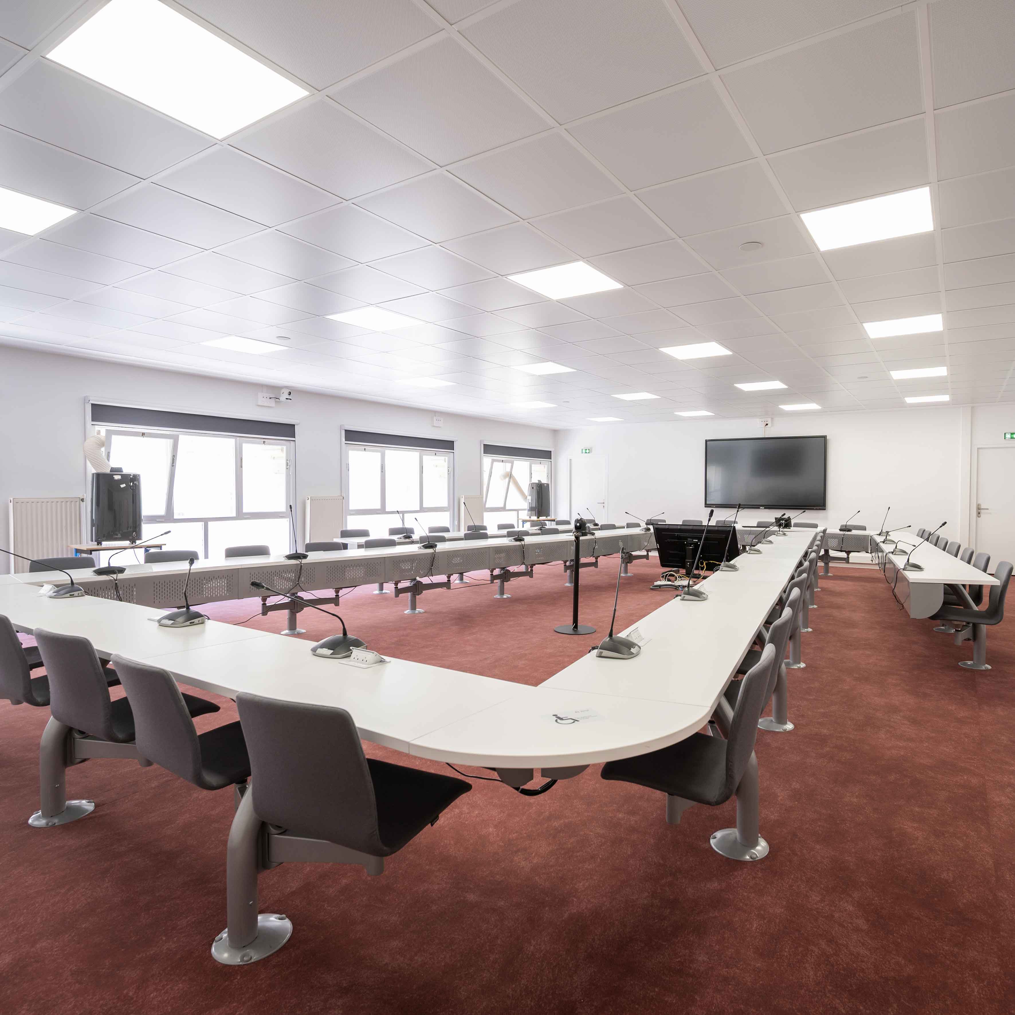 • Un système de micro conférence avec un micro par table (pour 2 participants) et un micro « chairman » pour l’intervenant relié à la sonorisation de la salle et au PC fixe.