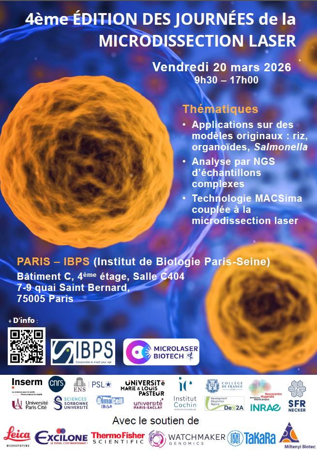 Le Réseau Micro Laser Biotech (RMLB) a le plaisir de vous inviter à la 4ᵉ édition des Journées de la Microdissection Laser, qui se tiendra le vendredi 20 mars 2026 à Paris, à l’IBPS – Institut de Biologie Paris-Seine.