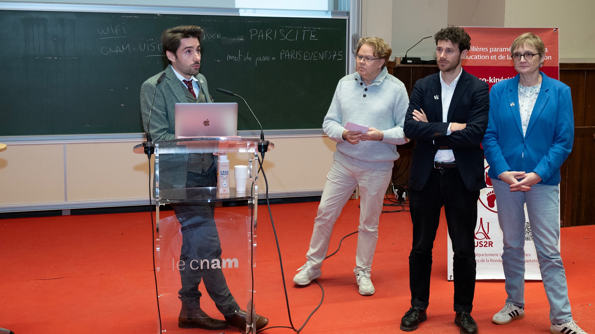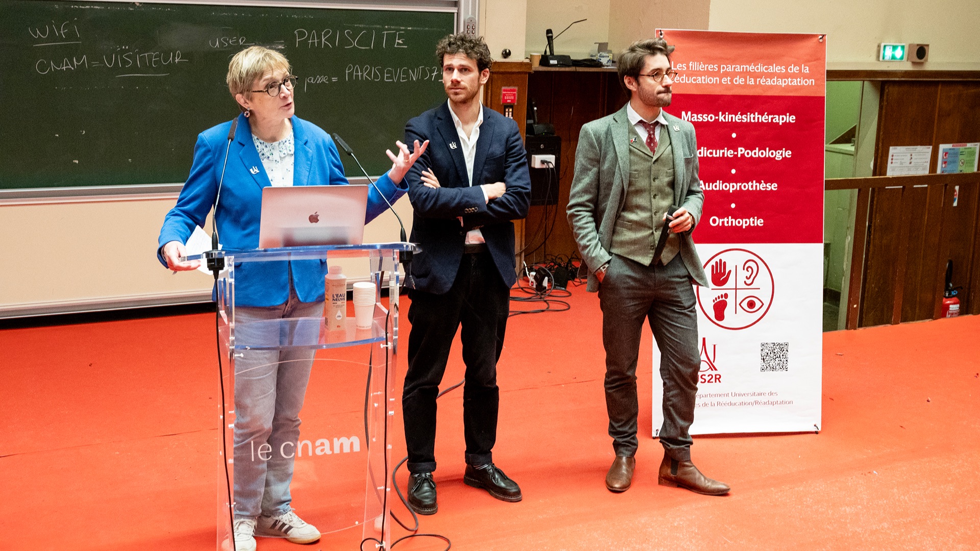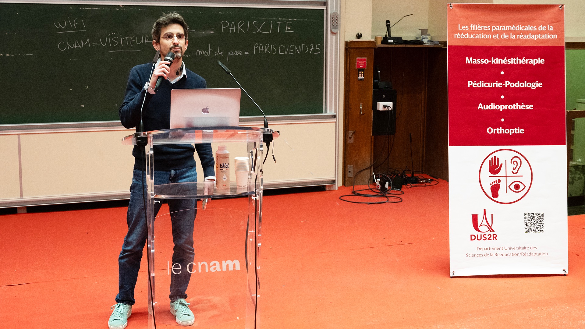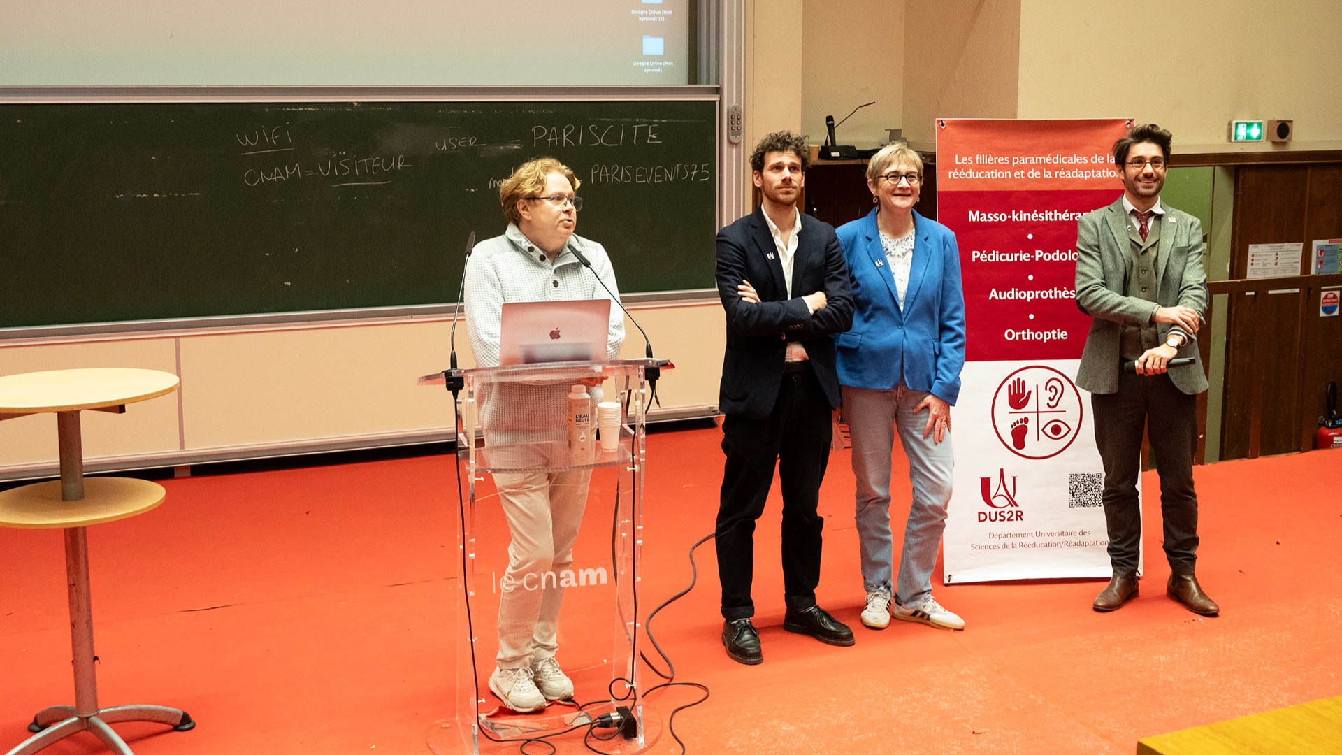 Le Département Universitaire de Sciences de la Rééducation et de la Réadaptation (DUS2R) de la Faculté de Santé a organisé, le mardi 18 novembre 2025 dans les locaux du CNAM, son troisième séminaire scientifique. Celui-ci a été riche en échanges et en valorisation des travaux étudiants et enseignants- chercheurs confirmés. L’événement a réuni la communauté pédagogique et scientifique autour de grands champs de la recherche intéressant spécifiquement les 4 formations du DUS2R : masso-kinésithérapie, pédicurie-podologie, orthoptie et audioprothèse.