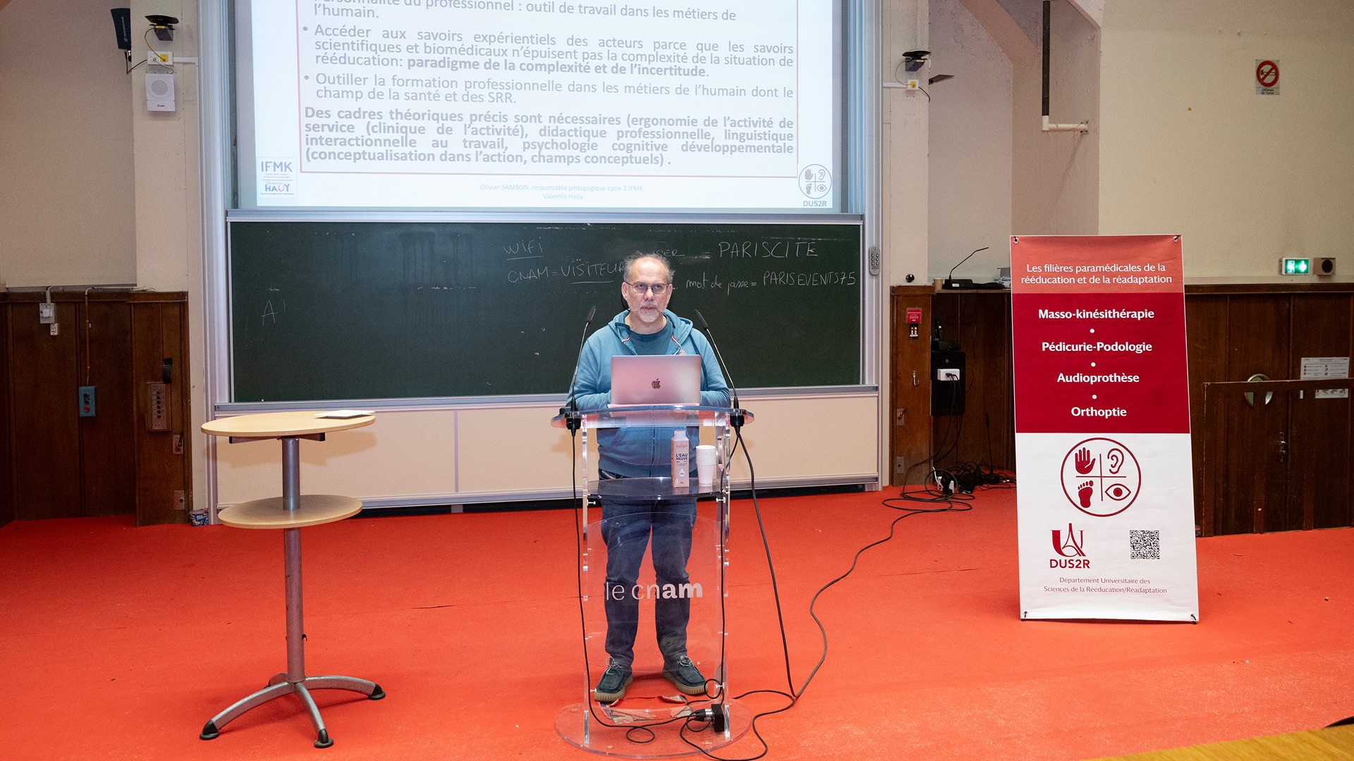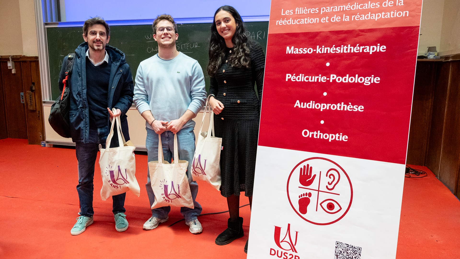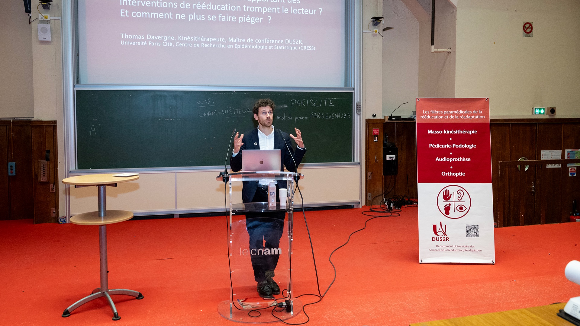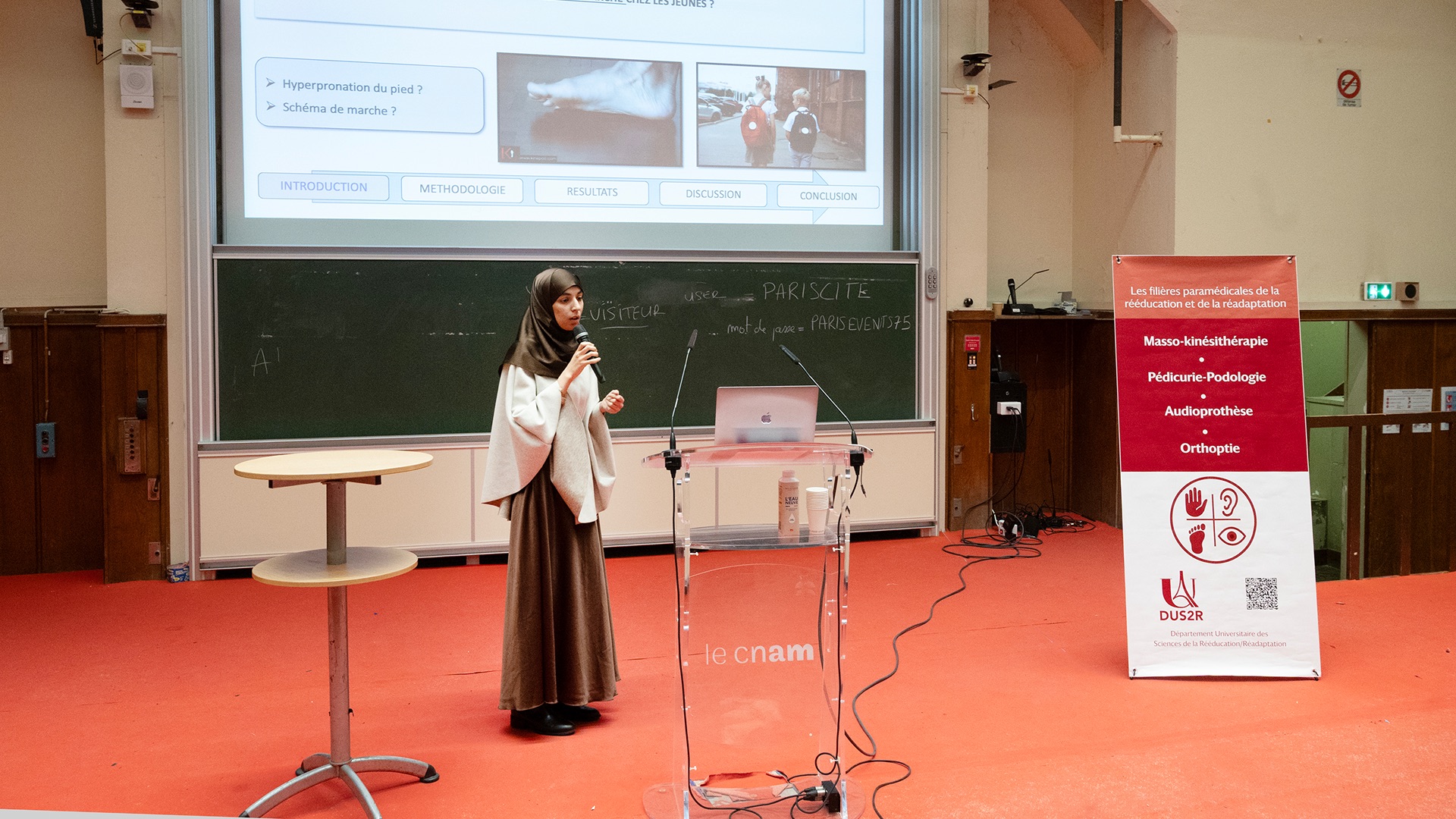 Le Département Universitaire de Sciences de la Rééducation et de la Réadaptation (DUS2R) de la Faculté de Santé a organisé, le mardi 18 novembre 2025 dans les locaux du CNAM, son troisième séminaire scientifique. Celui-ci a été riche en échanges et en valorisation des travaux étudiants et enseignants- chercheurs confirmés. L’événement a réuni la communauté pédagogique et scientifique autour de grands champs de la recherche intéressant spécifiquement les 4 formations du DUS2R : masso-kinésithérapie, pédicurie-podologie, orthoptie et audioprothèse.