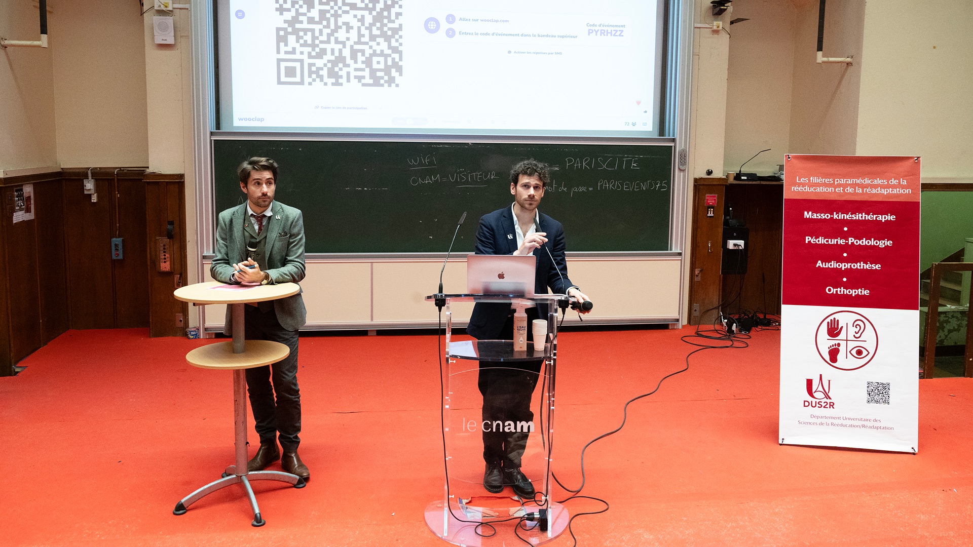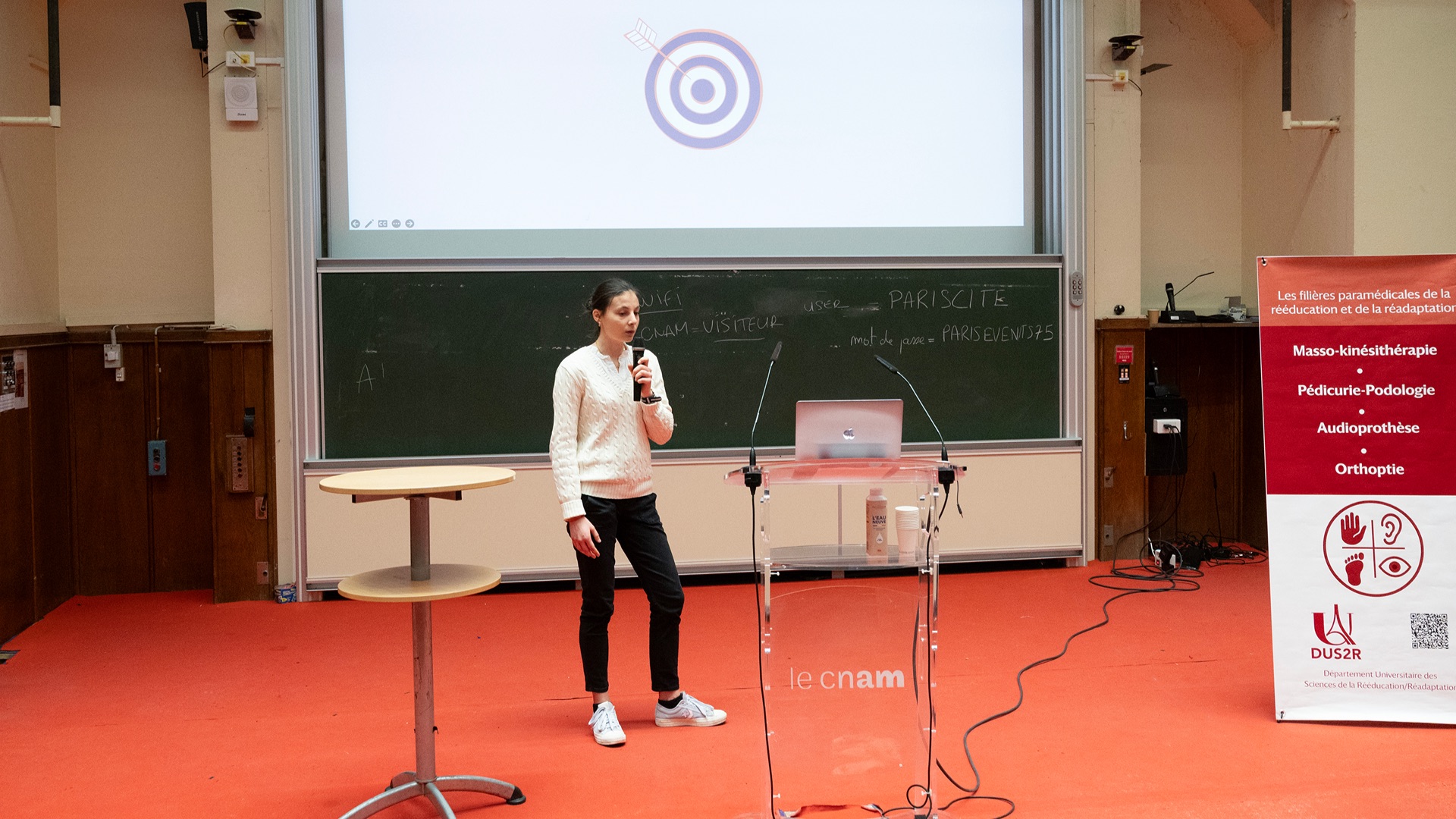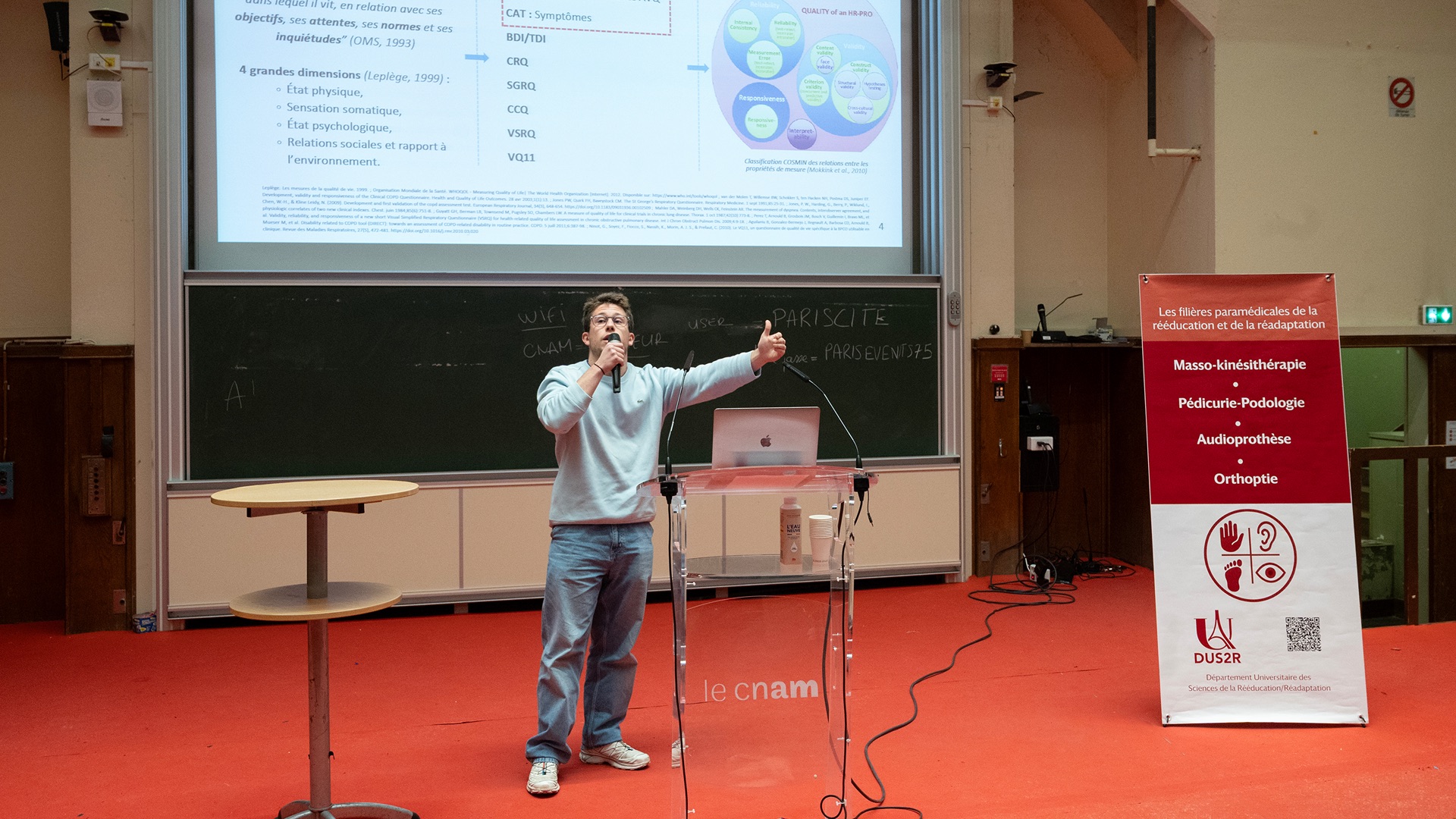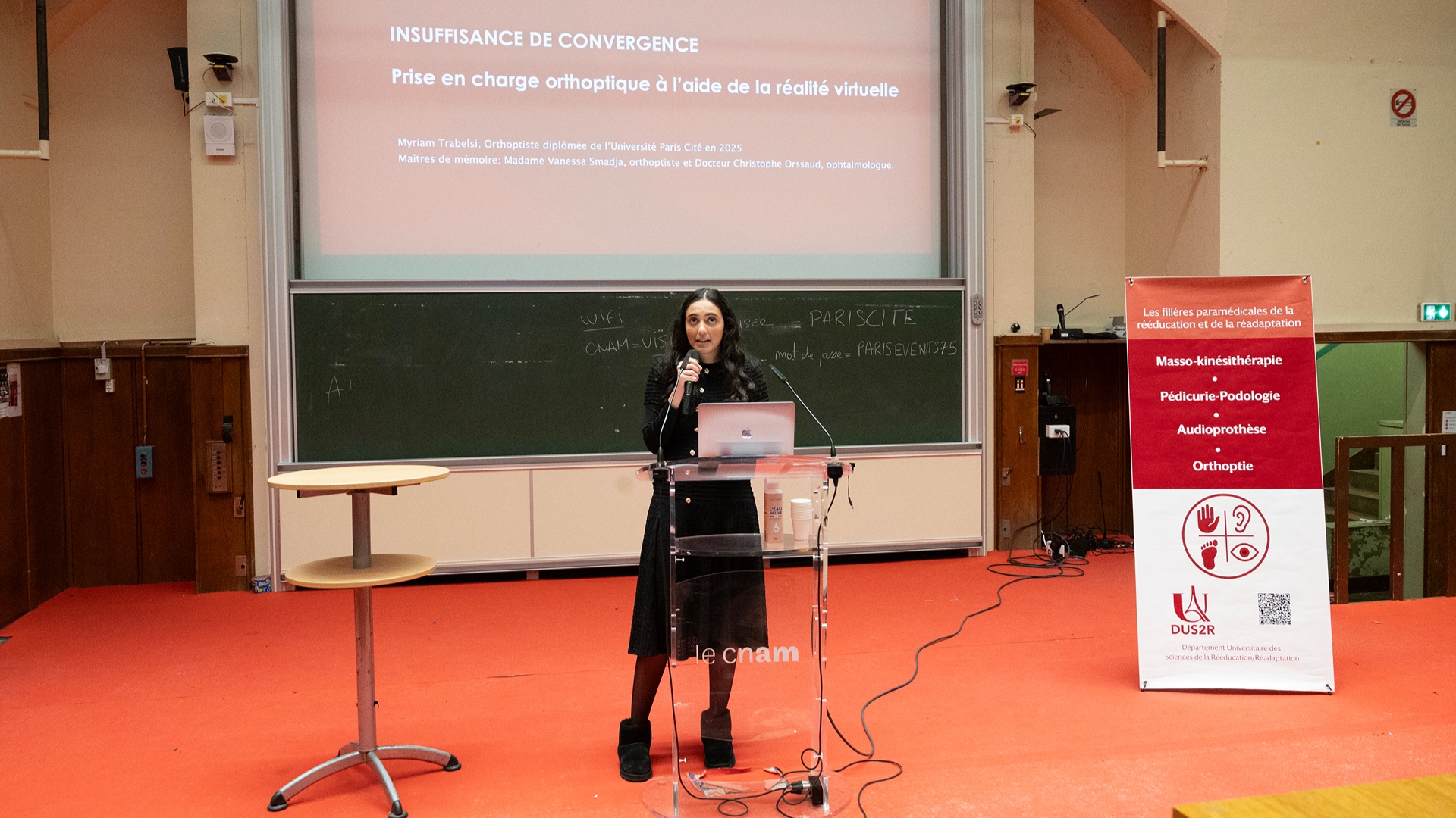 Le Département Universitaire de Sciences de la Rééducation et de la Réadaptation (DUS2R) de la Faculté de Santé a organisé, le mardi 18 novembre 2025 dans les locaux du CNAM, son troisième séminaire scientifique. Celui-ci a été riche en échanges et en valorisation des travaux étudiants et enseignants- chercheurs confirmés. L’événement a réuni la communauté pédagogique et scientifique autour de grands champs de la recherche intéressant spécifiquement les 4 formations du DUS2R : masso-kinésithérapie, pédicurie-podologie, orthoptie et audioprothèse.