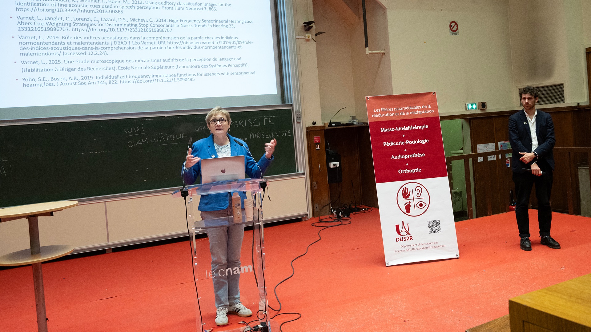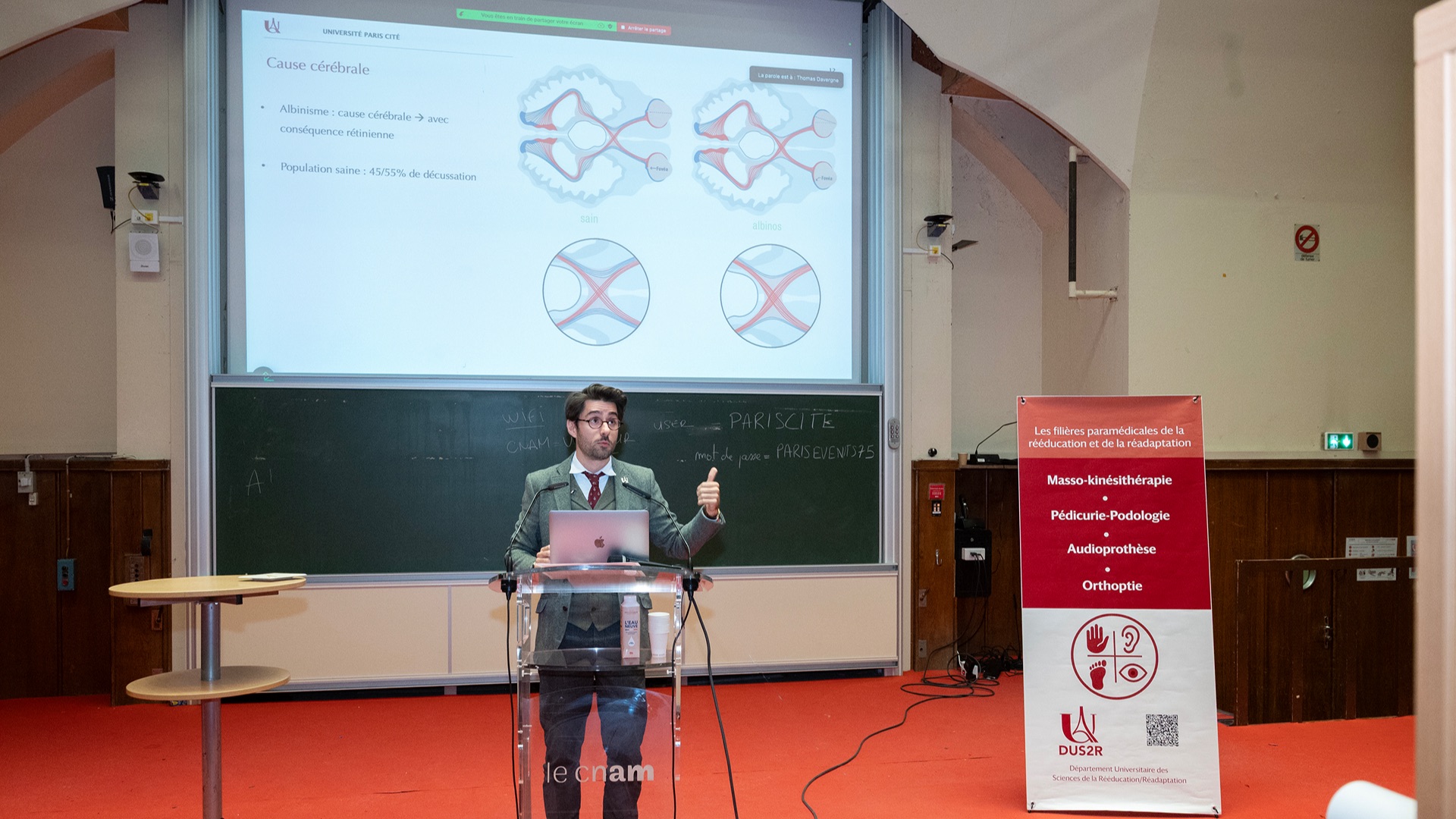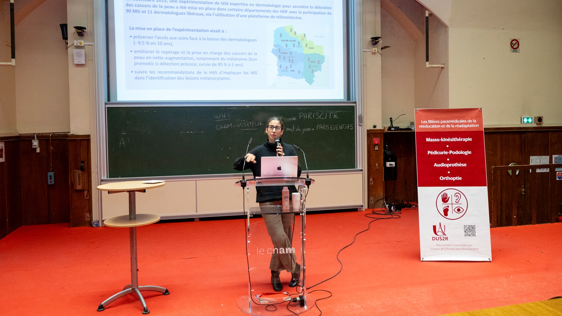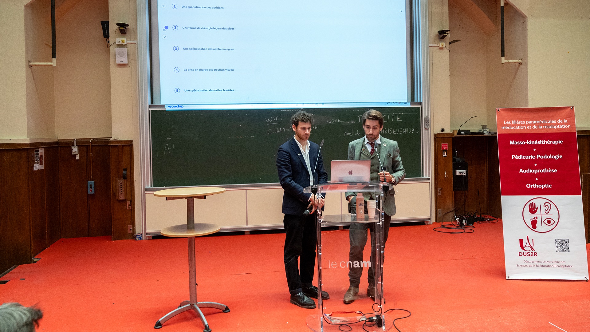 Le Département Universitaire de Sciences de la Rééducation et de la Réadaptation (DUS2R) de la Faculté de Santé a organisé, le mardi 18 novembre 2025 dans les locaux du CNAM, son troisième séminaire scientifique. Celui-ci a été riche en échanges et en valorisation des travaux étudiants et enseignants- chercheurs confirmés. L’événement a réuni la communauté pédagogique et scientifique autour de grands champs de la recherche intéressant spécifiquement les 4 formations du DUS2R : masso-kinésithérapie, pédicurie-podologie, orthoptie et audioprothèse.