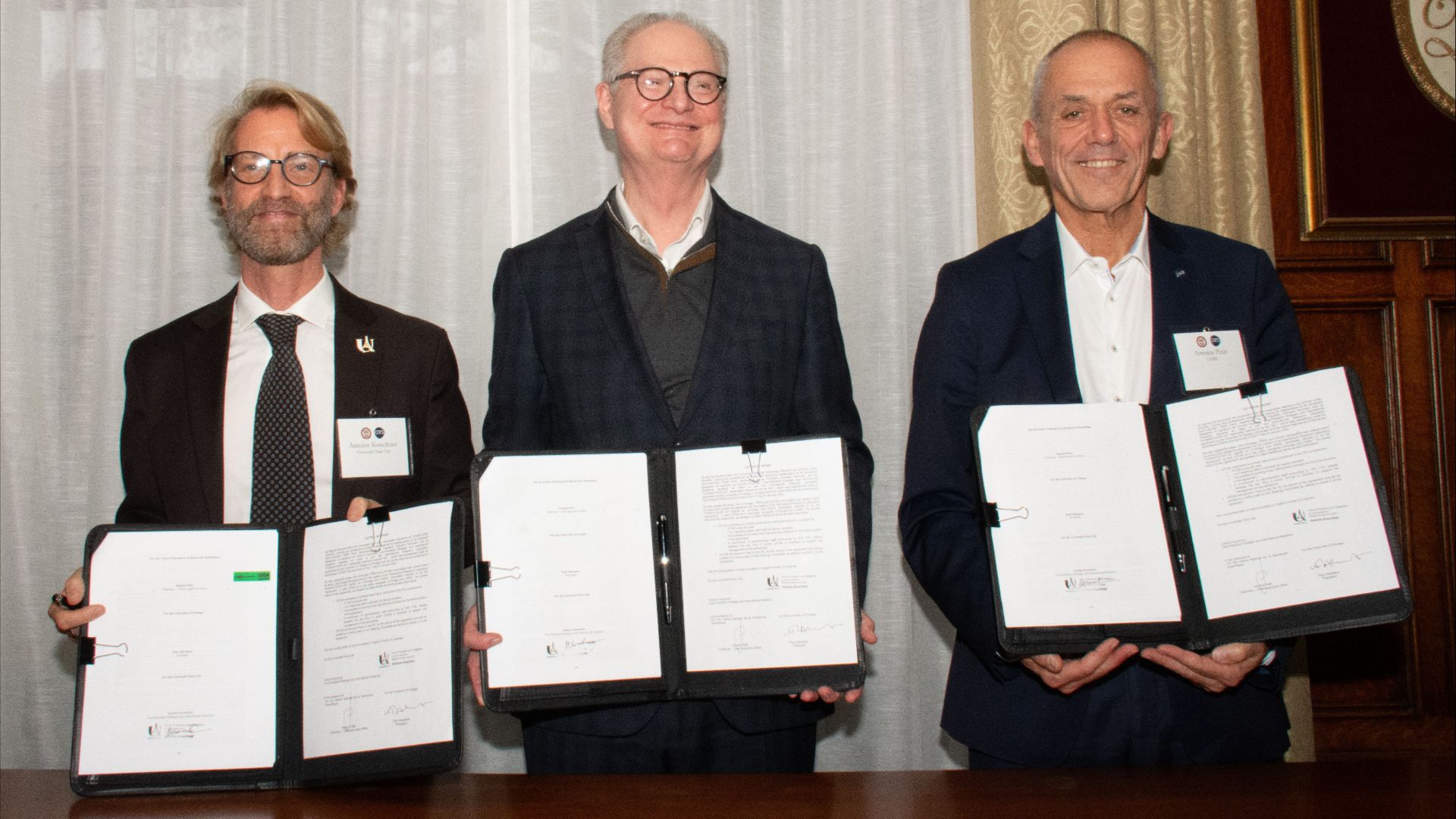 Antoine Kouchner, vice-président en charge des relations internationales à l’Université Paris Cité, Paul Alivisatos, président de l’Université de Chicago, et Antoine Petit, président-directeur général du CNRS.